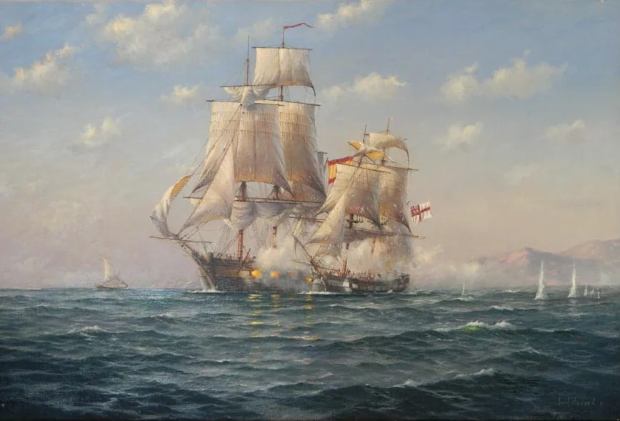 Imagem de Destaque: A pintura é de Montague Dawson sobre a batalha entre o El Gamo e o HMS Speedy – https://www.artsy.net/artwork/montague-dawson-the-heroic-speedy-and-gamo