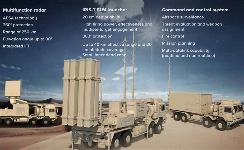 A Alemanha também entregou quatro lançadores do sistema IRIS-T SLM, que é capaz de atingir helicópteros, aeronaves, além de mísseis de cruzeiro, anti-navio, anti-radar e outros tipos de mísseis, ou seja, quase todas as classes de alvos aerodinâmicos. O IRIS-T é capaz de atingir alvos em altitudes médias e altas.
