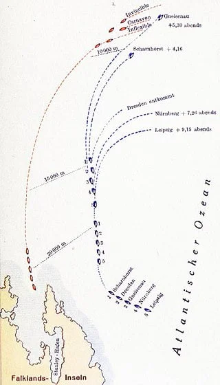 O plano de ataque do almirante Spee, previa que o SMS Gneisenai e o SMS Nürnberg navegassem para Porto Stanley para dar cobertura as tropas que desembarcariam, a fim de destruir a estação de rádio sem fio e outras instalações navais. Os cruzadores alemães deveriam dar apoio de artilharia ao assalto anfíbio. Ao se aproximar de Porto Stanley, Spee percebeu a presença da esquadra britânica, cancelou os desembarques e ordenou imediatamente que a esquadra se reagrupasse no mar. Apesar disso o SMS Scharnhorst atacou o HMS Canopus que protegia o porto. Spee, após verificar a superioridade da esquadra britânica, decidiu fugir em direção a sudeste. Os britânicos saíram em perseguição, sendo mais velozes, ao colocarem os navios alemães no alcance dos seus canhões, abriram fogo.