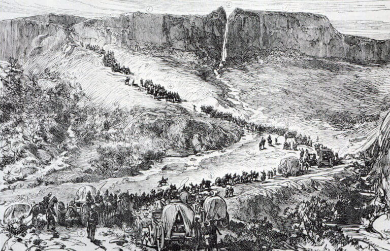 Coluna de Lord Chelmsford levando as carroças após a Batalha de Isandlwana em 22 de janeiro de 1879, na Guerra Zulu: imagem de Melton Pryor