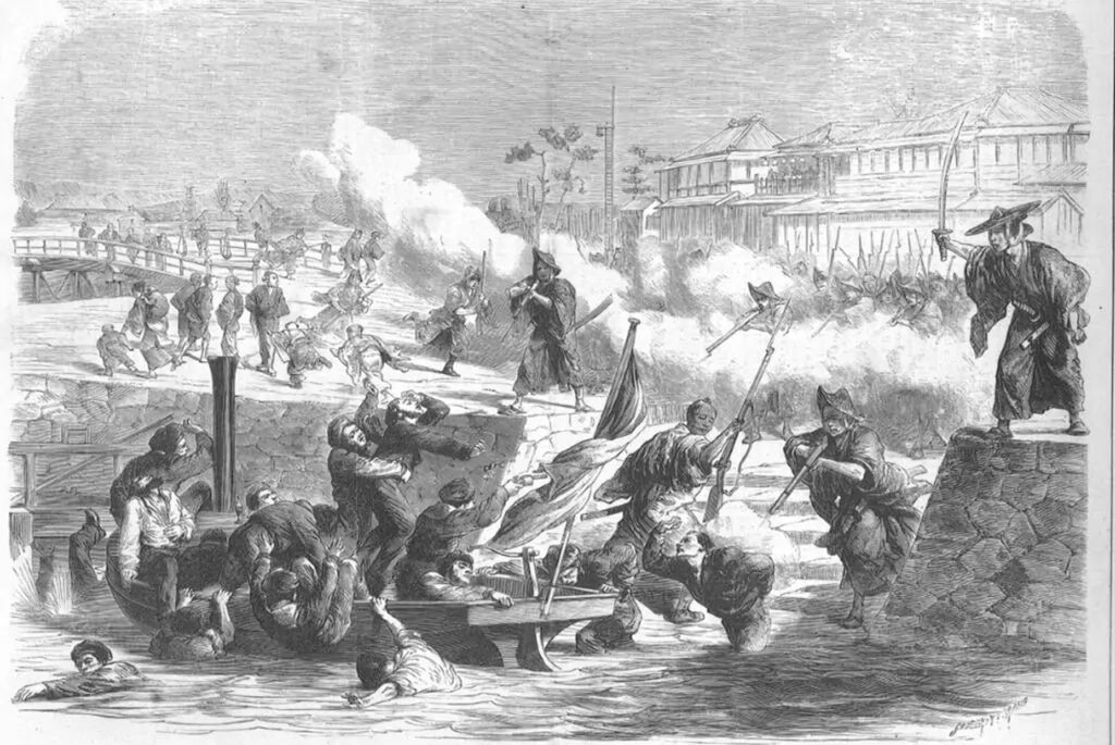 Nakazawa Koto e seu irmão juntaram-se às forças do xogunato de Edo, os Shinchōgumi. Durante a Guerra Boshin, Koto aliou-se aos Tokugawa. Ações militares das forças imperiais e atos de violência de apoiadores Meiji em Edo levaram o xogum Tokugawa Yoshinobu a atacar e tentar controlar a corte Meiji em Kyoto.