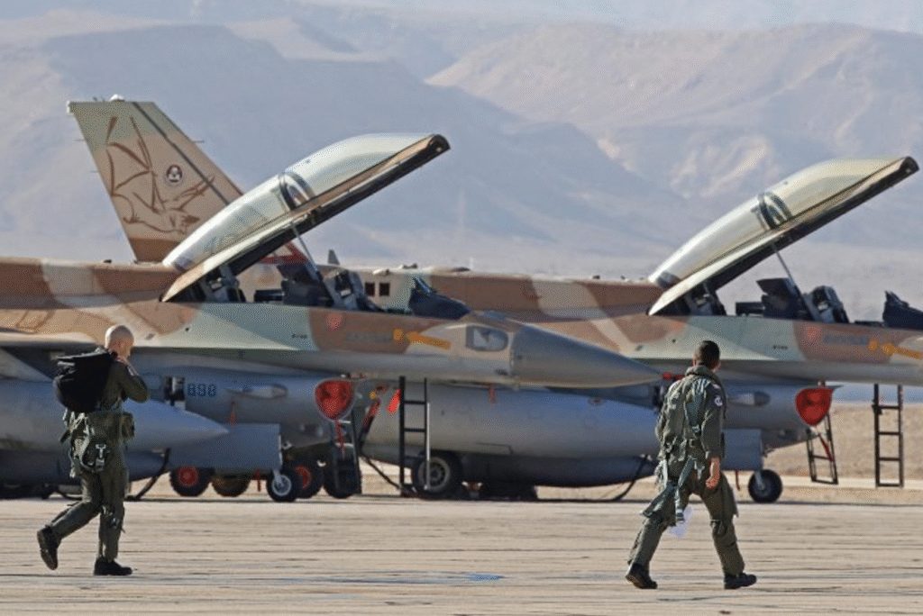 Pilotos israelenses caminham até seus caças durante um exercício em 2021. Foto: jack guez/Agence France-Presse/Getty Images