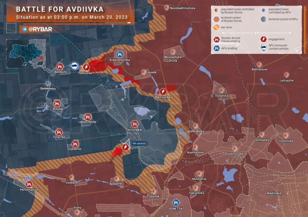 Na data de 23/03/2023, os militares russos conseguiram avançar para o oeste de Novobakhmutovka, no norte da área fortificada de Avdeevsky, liberando completamente aquele assentamento. Ao sul de Novobakhmutovka, as Forças Armadas Russas conseguiram capturar dois redutos na área da rodovia H20, enquanto que as batalhas posicionais continuam perto de Petrovsky – os militares russos conseguiram expandir a zona de controle ao redor da ferrovia.
