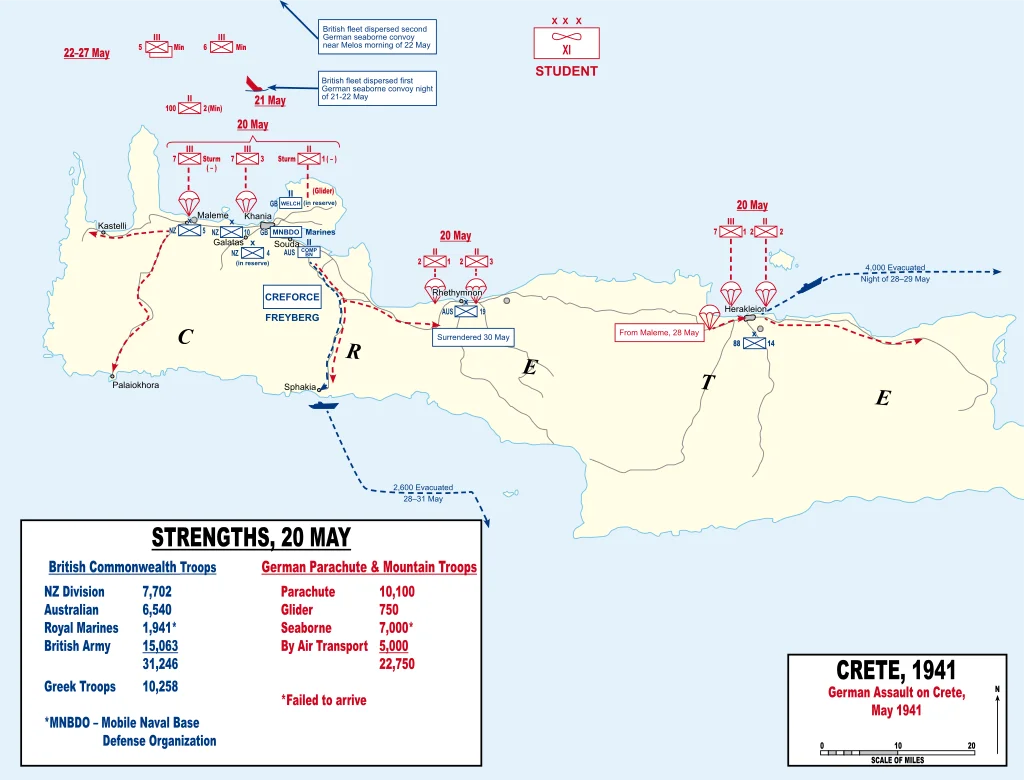 Em 20 de maio de 1941, foi deflagrada a Operação Mercury, um ataque a ilha de Creta com um assalto aeroterrestre de paraquedistas alemães da 7ª Divisão Aérea e tropa aerotransportada da 5ª Divisão de Montanha. Devido ao controle de área marítima exercido pela Marinha Britânica (Royal Navy – RN) e a superioridade aérea alemã, a opção o Alto Comando da Wehrmacht (Oberkommando der Wehrmacht – OKW) foi realizar um assalto aéreo.