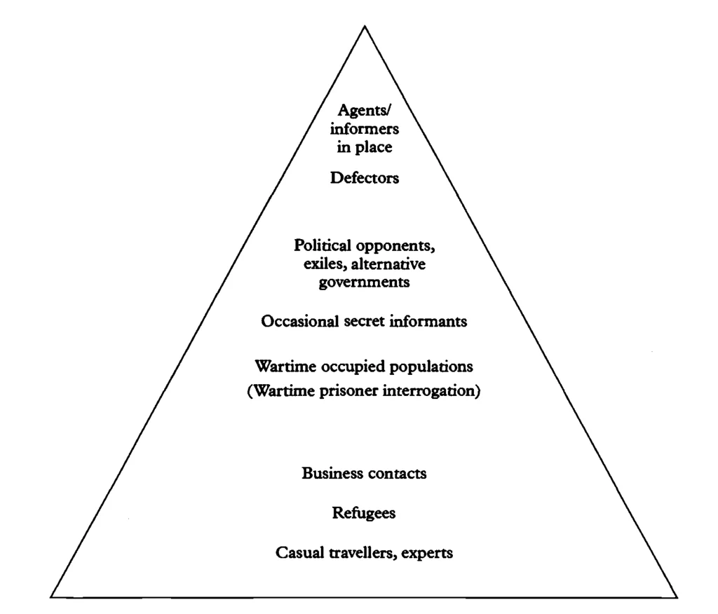 Ao considerar esta complexidade, Michael Herman (HERMAN, 1996, p. 61-66) propôs um esquema piramidal a fim de ilustrar como este tipo de fonte se relaciona com Agências de Inteligência. Nesta ilustração, as fontes cujos dados fornecidos são menos significativos compõem a base, enquanto o topo é reservado para as fontes capazes de fornecer dados potencialmente mais valiosos e confiáveis. Assim, na base na pirâmide, estão viajantes – turistas, Marinha Mercante, etc. –, refugiados, contatos no mundo dos negócios e informantes casuais. Na parte intermediária da pirâmide estão populações de territórios ocupados, prisioneiros de guerra interrogados e políticos que fazem oposição ao inimigo. Próximo ao topo, temos os agentes de Inteligência propriamente ditos, sobre os quais figuram os agentes de órgãos de Inteligência adversários, funcionários de departamentos do governo concorrente – generais, diplomatas, membros de comissões científicas, etc. – e componentes de grupos clandestinos que secretamente também trabalham para a Agência.