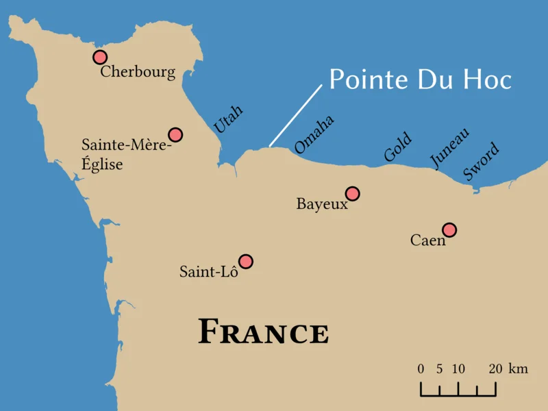 Dentro das ações que aconteceram durante o “Dia D” está a conquista da Pointe du Hoc, uma falésia rochosa de aproximadamente 25 a 30 metros de altura que tinha recebido uma bateria de artilharia alemã.
