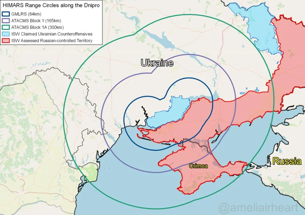Cabe ainda acrescentar que, com a retomada de Kherson, a artilharia da Ucrânia passa a ter a seu alcance uma fatia da Crimeia. Caso a Ucrânia recebesse dos EUA mísseis ATACMS, que são usados no Sistema Lançador de Foguetes Múltiplos HIMARS e chegam a 300 km de raio, toda a Crimeia estaria a seu alcance. No caso, não só a Crimeia, mas todas as áreas ocupadas na Ucrânia, além de diversas cidades em território russo. É justamente por conta desse último fato que dificilmente os EUA fornecerão esses mísseis à Ucrânia neste momento, à despeito da insistência de Zelensky e tendo em vista as ameaças de Putin de passar a considerar os Estados Unidos como país “diretamente envolvido” na guerra, caso isso aconteça. Na atual conjuntura, é improvável que esses mísseis sejam fornecidos a Ucrânia e Biden tem recusado sistematicamente ceder aos pedidos de Zelensky. De qualquer forma, novos avanços das forças ucranianas pelo Oblast de Kherson colocarão cada vez mais área da Crimeia sob o alcance da artilharia, vide o mapa abaixo: