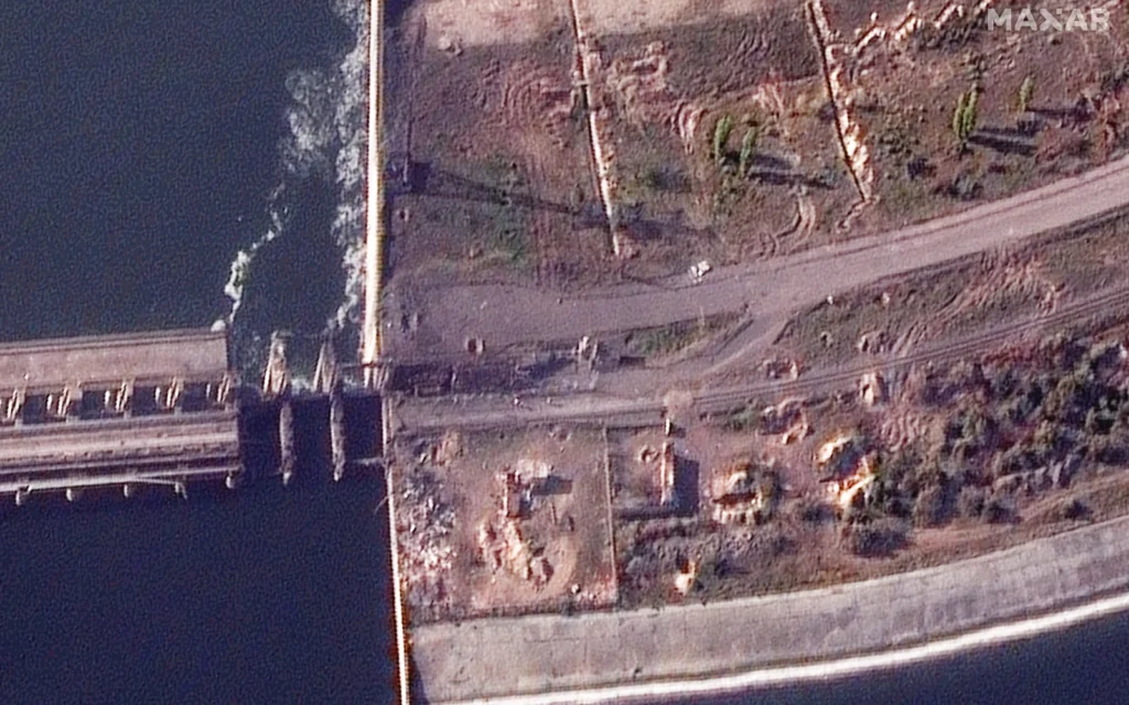 Seção danificada na passagem da barragem de Nova Kakhovka: