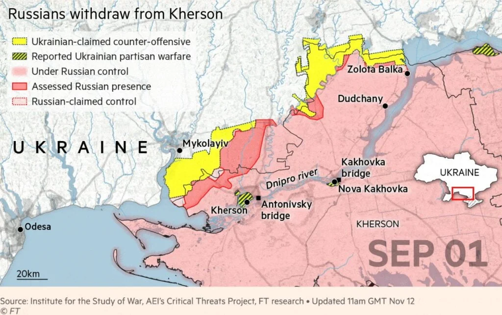 Há evidências de que os russos abandonaram a ideia de retomar Kherson no curto prazo, vide a intensificação da destruição de pontes que os ucranianos já haviam alvejado. Na retirada russa foram intensificados os danos nas seguintes pontes: ponte rodoviária Antonovsky (importante rota logística que já havia sido bombardeada e tido o trânsito inviabilizado por artilharia de precisão da Ucrânia, mas que os russos terminaram de destruir); ponte ferroviária Antonovsky; ponte Darivka; e uma seção da passagem da barragem de Nova Kakhovka (fundamental para manutenção da usina nuclear de Zaporizhia). Todas essas pontes davam acesso de uma margem a outra do rio Dnieper. A retirada russa durou três dias e estima-se que 20 mil soldados russos e 3,5 mil unidades de equipamento militar se deslocaram para o lado leste do rio Dnieper.
